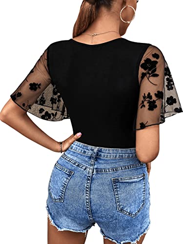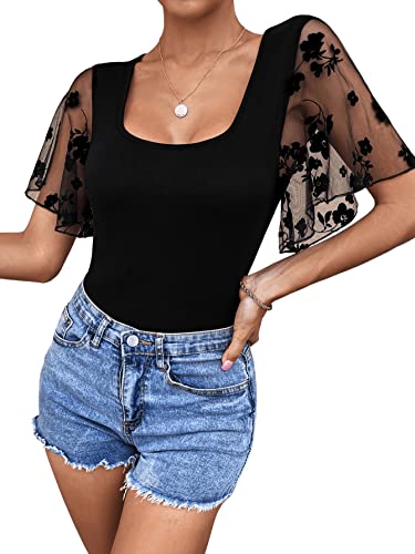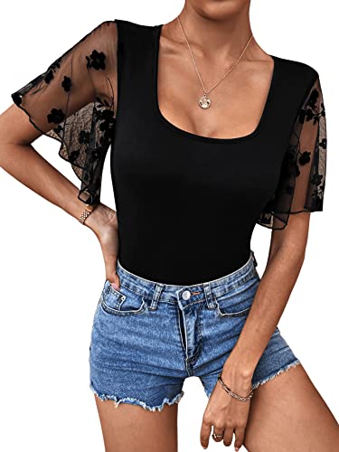 GORGLITTER Elegant Body Damen Bodysuit Meshärmel Sommershirt Mesh-oberteil Slim Overall mit U-Ausschnitt