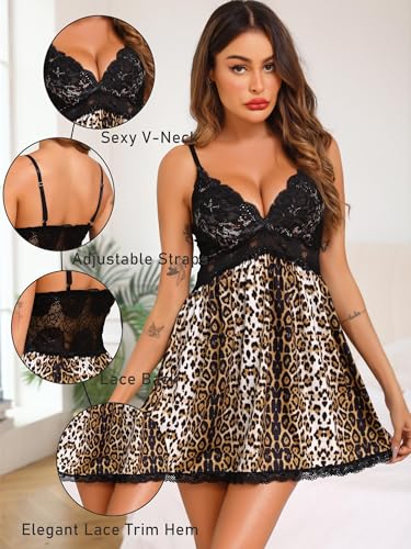 Vlazom Damen Sexy Nachthemd Spitzen Negligee V-Ausschnitt Schlinge Nachtkleid Babydoll mit Tanga